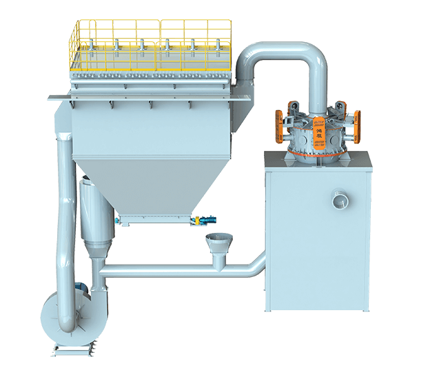 開路系統(tǒng):物料通過給料機定量進入進料管道,與系統(tǒng)進風(fēng)混合均勻后,由下端入料口進入分級機,符合粒徑要求的細顆粒隨氣流進入脈沖收集器,粗顆粒夾帶部分細顆粒沿筒壁下降至二次風(fēng)處,經(jīng)二次風(fēng)的淘洗作用,使粗細顆粒分離,細顆粒上升至分級區(qū)進行二次分級,粗顆粒下降至下料口排出。